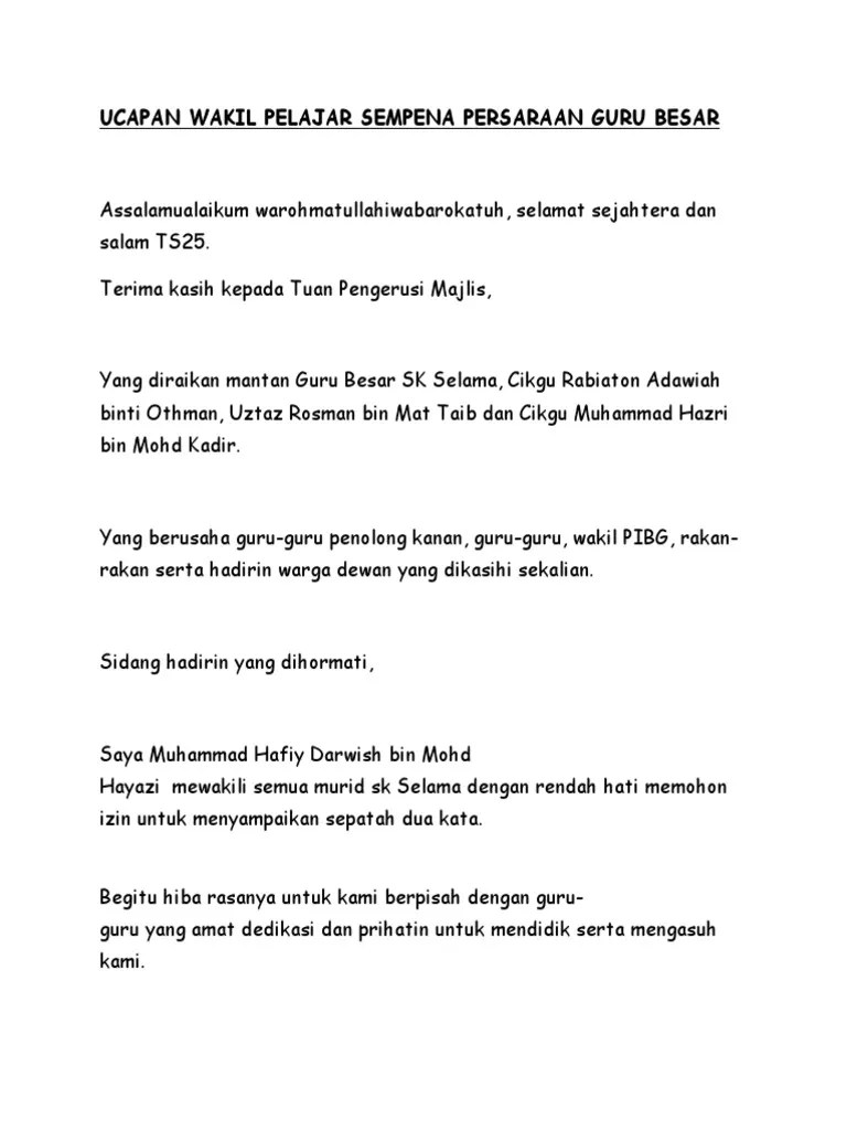 Dikasihi dan diraikan cikgu abu naim bin hamzah guru besar skfn ~ yang berusaha penolong kanan pentadbiran puan hajjah . Yang dihormati en abdullah bin ghani guru penolong kanan hem yang saya hormati en mat. Teks ucapan persaraan guru besar. Assalamualaikum warahmatullahiwabarakatuh / selamat petang selawat terima kasih saudara pengerusi majlis~ yang berbahagia tuan ppd perak tengah~ yang .